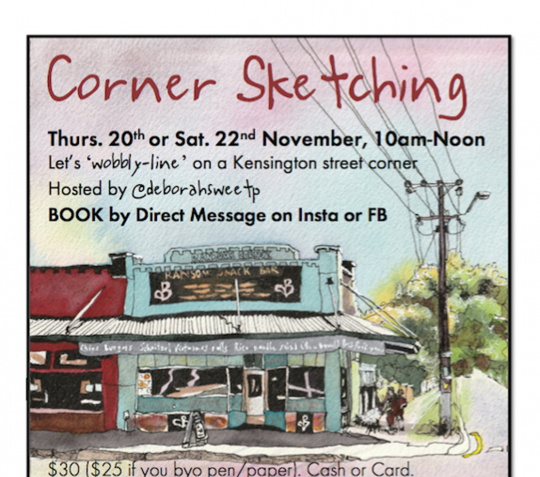 Sketch, squiggle & scrawl together on a local Kensington street corner. Local artist, Deborah Smalley, hosts a 2 hour "wobbly-line"... read more about the Nov Corner Sketching in Kensington event